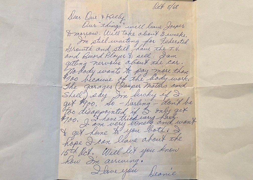 Our ‘things’ will leave Jasper tomorrow. Will take 3 weeks. I’m still waiting for Federated Growth and still have the T.V. and record player to sell. I am getting nervous about the car. Nobody wants to pay more than $700 because of the body work. The garages (Jasper Motors and Shell) say I’m lucky if I get $900, So – Darling – don’t be too disappointed if I only get $700. I have tried really hard. I am very lonely and want to get home to you both. I hope I can leave about the 15th Oct. Will let you know how I’m arriving.