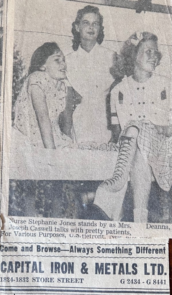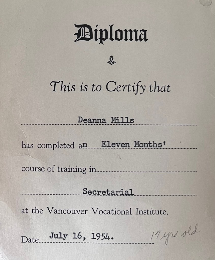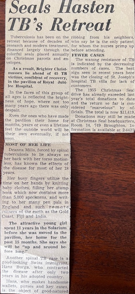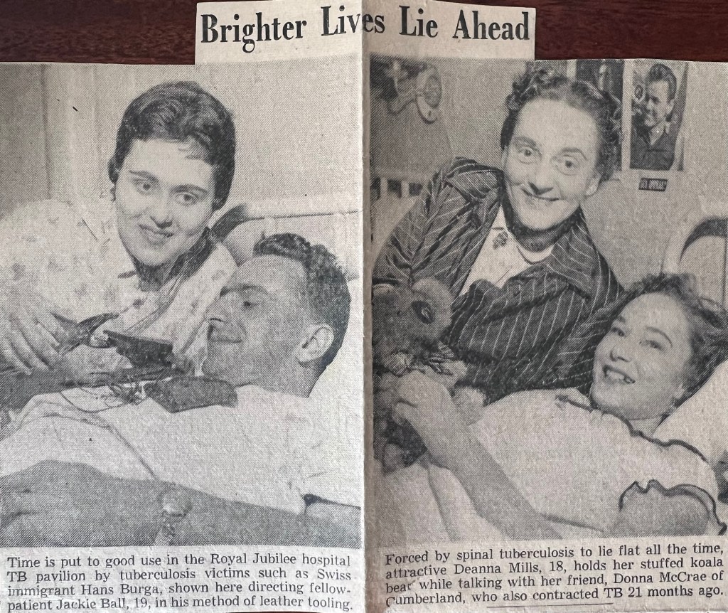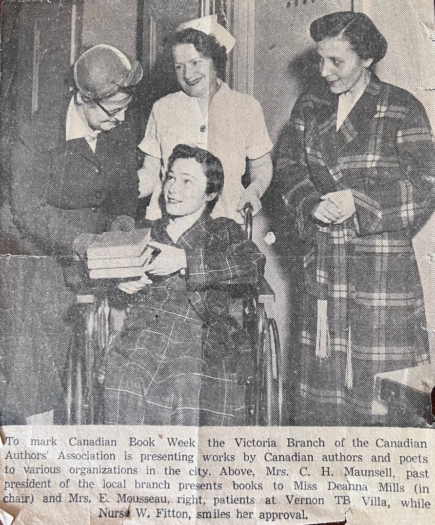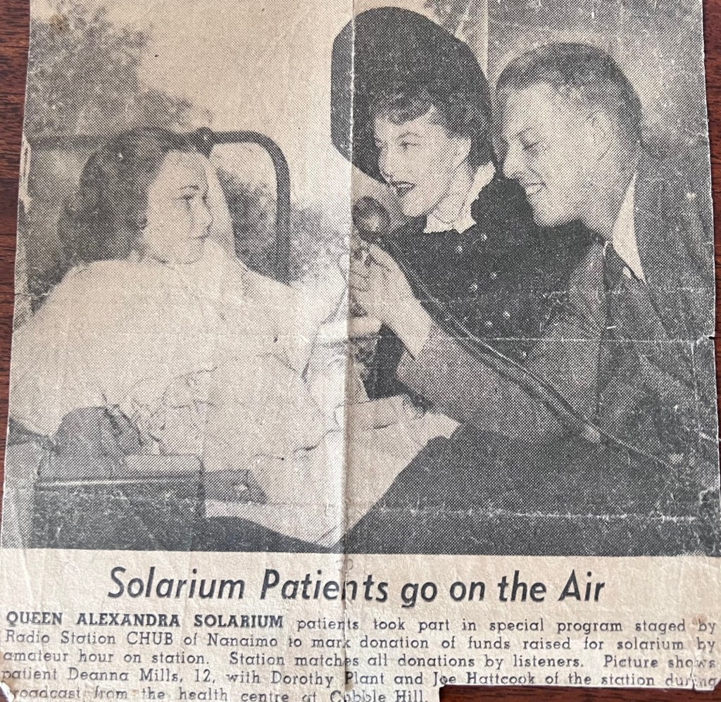 Deanna was born March 21st, 1937 to Grace Lucretia Henry and William Mills. In November of 1938 Deanna had contracted tuberculosis which had travelled to her spine (Pott’s Disease) and was subsequently ‘placed’ in Queen Alexandra Solarium, in Mill Bay, B.C..