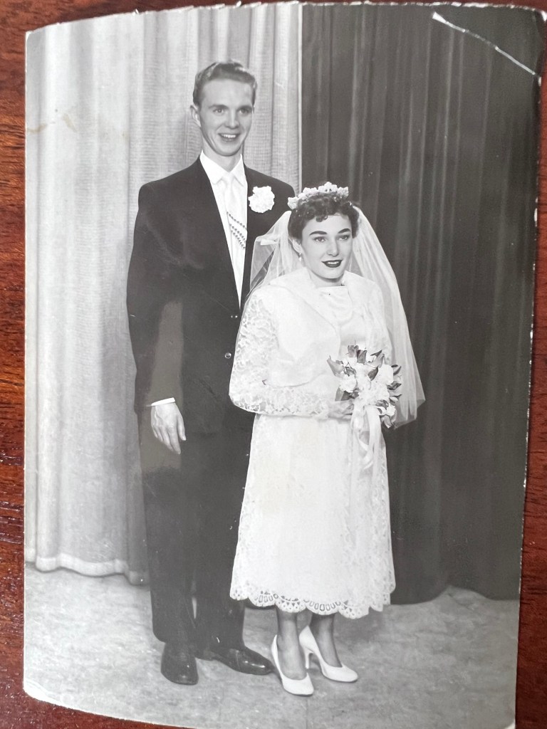 Wesley United Church. The bride wore a graceful waltz-length gown of white satin with full lace overskirt and matching jacket. A tiara of seed pearls held her chapel veil and she carried a colonial bouquet of roses and white carnations. Miss Myrna Vanetta, maid of honor wore a waltz-length blue taffeta gown with matching headdress and carried a colonial bouquet of pink carnations and white freesia.